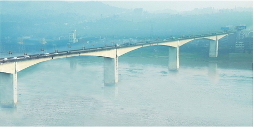 宜賓長江大橋 萬里長江第一橋,全長931.42米,主跨460米,雙塔雙索面PC砼斜拉橋,2008年4月建成通車。獲中國公路學(xué)會科學(xué)技術(shù)三等獎。