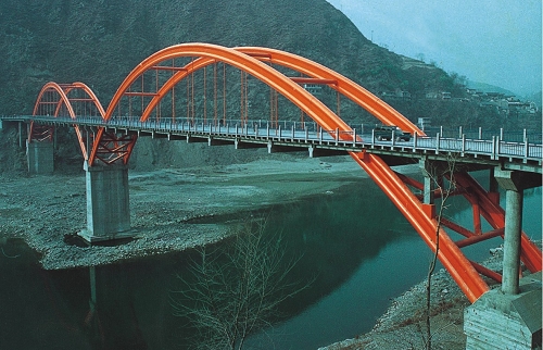 廣元旺蒼東河大橋 全長248米,主跨115米,下承式預(yù)應(yīng)力系桿鋼管砼拱橋,1990年5月建成通車。我國第一座鋼管砼拱橋。