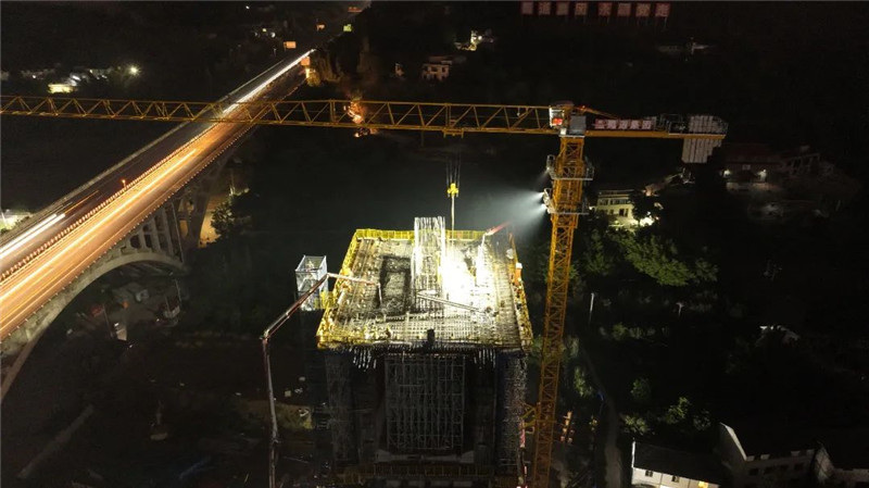 隆黃鐵路隆敘段瀘州沱江鐵路特大橋主橋?qū)侔嗡髅嫘崩瓨?酒樽造型),是國內(nèi)同類型最大跨度的鐵路單索面斜拉橋。該橋既是項目部的重點工程,也是全線的控制性工程。10#墩、11#墩0#塊件長20m,高14m,頂寬15.8m,底寬11.7m,設(shè)計混凝土方量為2400?,本次10#墩澆筑混凝土為1050?,澆筑高度為7.8-14m。此次澆筑的順利完成,標(biāo)志著沱江鐵路特大橋上部構(gòu)造施工拉開序幕,項目整體施工取得階段性勝利,為沱江鐵路特大橋在2023年完成建設(shè)任務(wù)奠定了堅實的基礎(chǔ)。
