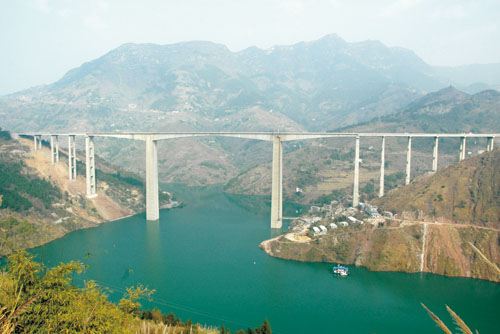 全長(zhǎng)950.44米,主跨230米,主墩高156米,預(yù)應(yīng)力砼連續(xù)鋼構(gòu)橋,2008年12月建成通車。